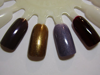 | Van L naar R: Ltd Edition: 005 Forest Floor & 006 Attitude, 568 Metallic Purple, 569 Flamingo, 581 Orange Drops |