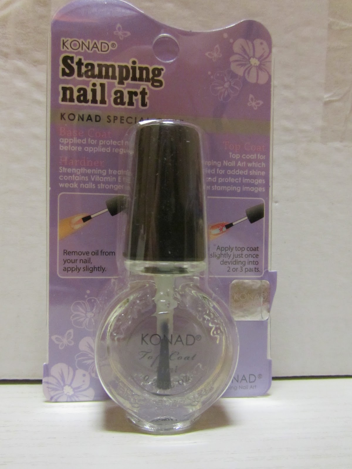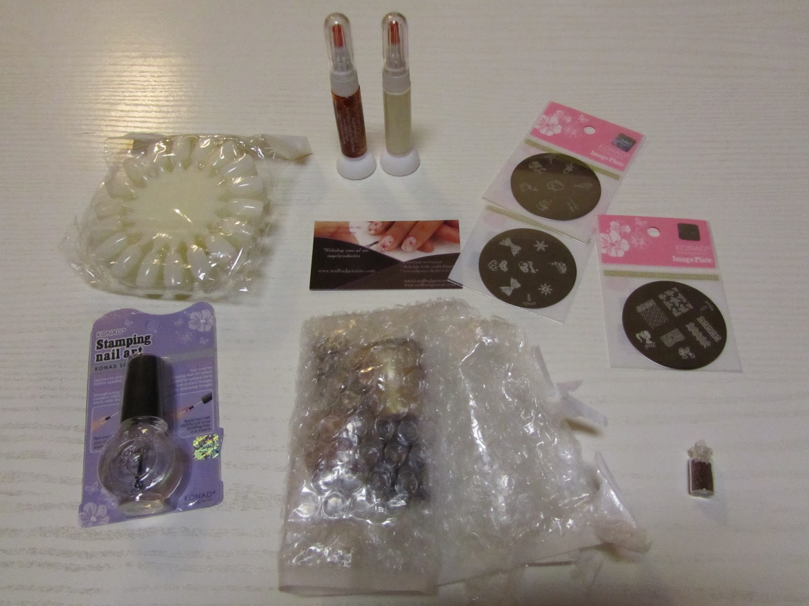 | Nagellakwielen, Konad Top Coat, 2 nail art pens, 3 Konad Image Plates, klein flesje met nageldecoratie, en in de bubbelfolie zitten 2 Nubar lakjes. |