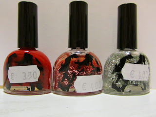 | Deze 3 kleurtjes komen uit een carnavalswinkel. Het is een rode 1970Y, een doorschijnende nagellak met rode glitters 1975P en een doorschijnende nagellak met zilveren glitters 1973H. |