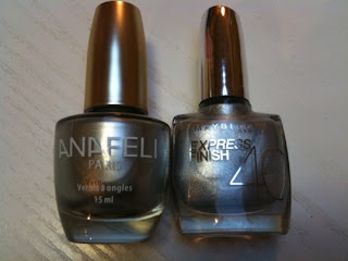 Ik testte eerst beide kleurtjes uit. Ja, ik weet het, ze zijn beide zilver! Maar die van Maybelline (rechts) had iets meer glitters. Ik heb dan maar eerst een laagje Anafeli (dekt enorm goed en het is echt een mooie grijze kleur!) opgedaan, maar dat bleek nogal saai te zijn... Dus besloot ik er een laagje Maybeline over te doen.