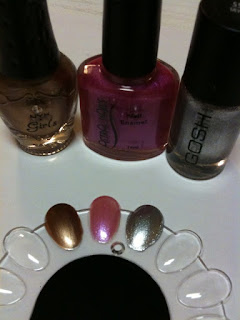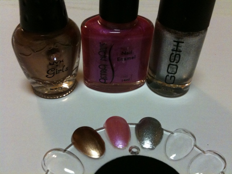 Van L naar R: NYX Girls: Walnutfrost, Astra Nails VA.996G (Candy Collection) en als laatste GOSH 555 Silver.
