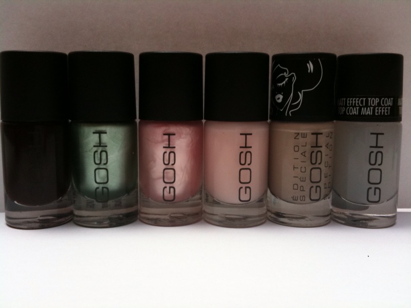 Van L naar R: GOSH 599 Night Kiss, 567 Metallic Green, 086 Rose, 045 Silk, 003 Groovy Grey, 600 Matt Effect Top Coat Dan de 2B kleurtjes: |