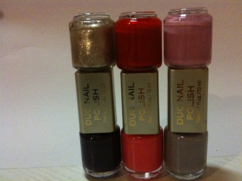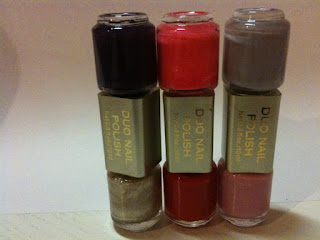 Vandaag was ik bij H&M om wat kledij te kopen voor mijn meisjes. Toen ik aan de kassa aan het aanschuiven was, zag ik in een bak nagellaksetjes liggen. Ik had zulke setjes nog nooit gezien! 2 kleurtjes en 1 stopsel! Ik kon het me niet laten en heb 3 setjes gekocht. Zoiets speciaals mocht gewoon niet ontbreken in mijn stash!
