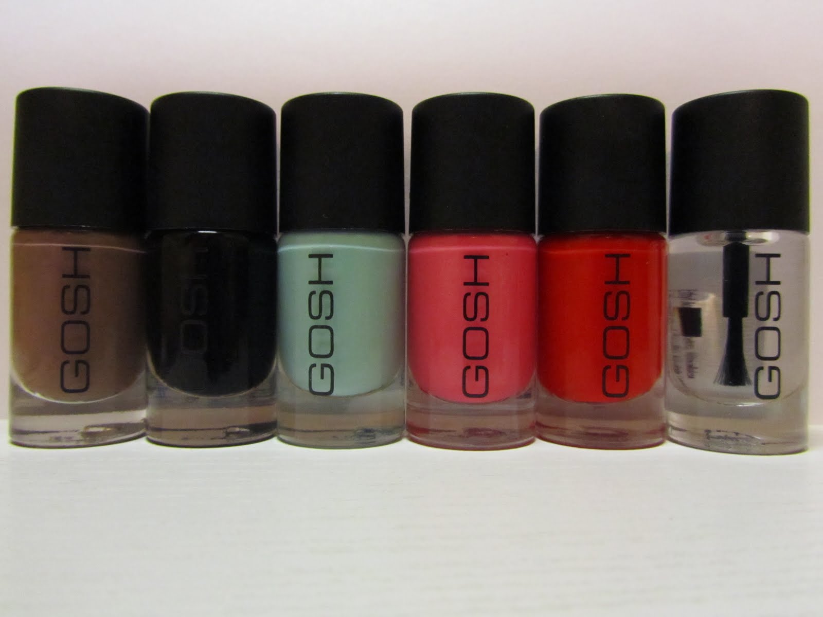 GOSH: van L naar R: 596 Miss Mole, Nero, 597 Miss Minty, 543 Pink Rose, 587 Hot Coral, 01 Base/Top Coat