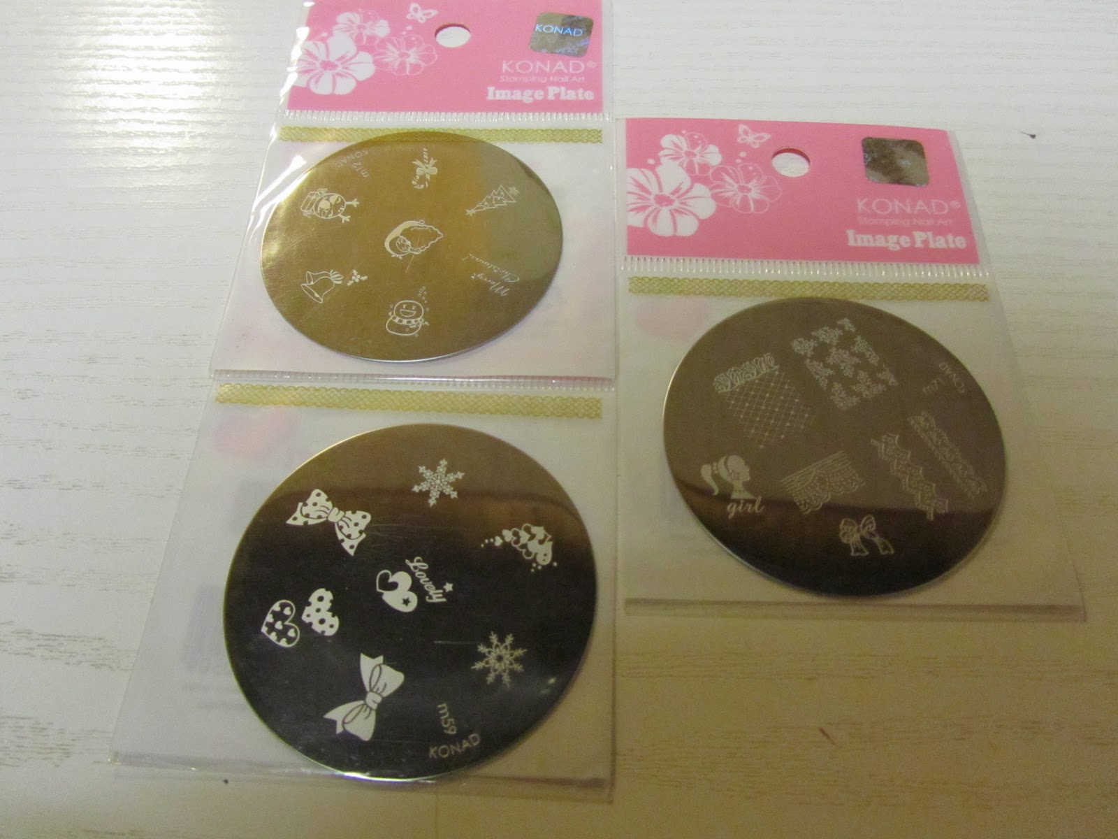 | Nagellakwielen, Konad Top Coat, 2 nail art pens, 3 Konad Image Plates, klein flesje met nageldecoratie, en in de bubbelfolie zitten 2 Nubar lakjes. |