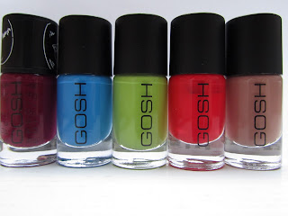 | GOSH van L naar R: 008 Berry Me, 605 Blue Balloon, 606 Early Green, 607 Crispy Coral, 608 Dusty Rose |