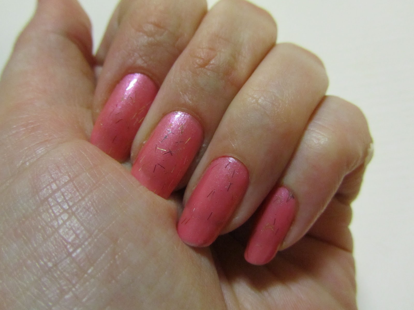 Een dag of 2 nadat ik mijn nagels roze had gelakt met het 2B potje, besloot ik ze op te frissen. Ik deed er een laagje Paris Memories over. Dit doorschijnend lakje bevat langwerpige glitters. Het deed me denken aan de vuurwerksticks die je op een taart zet bij een verjaardag!