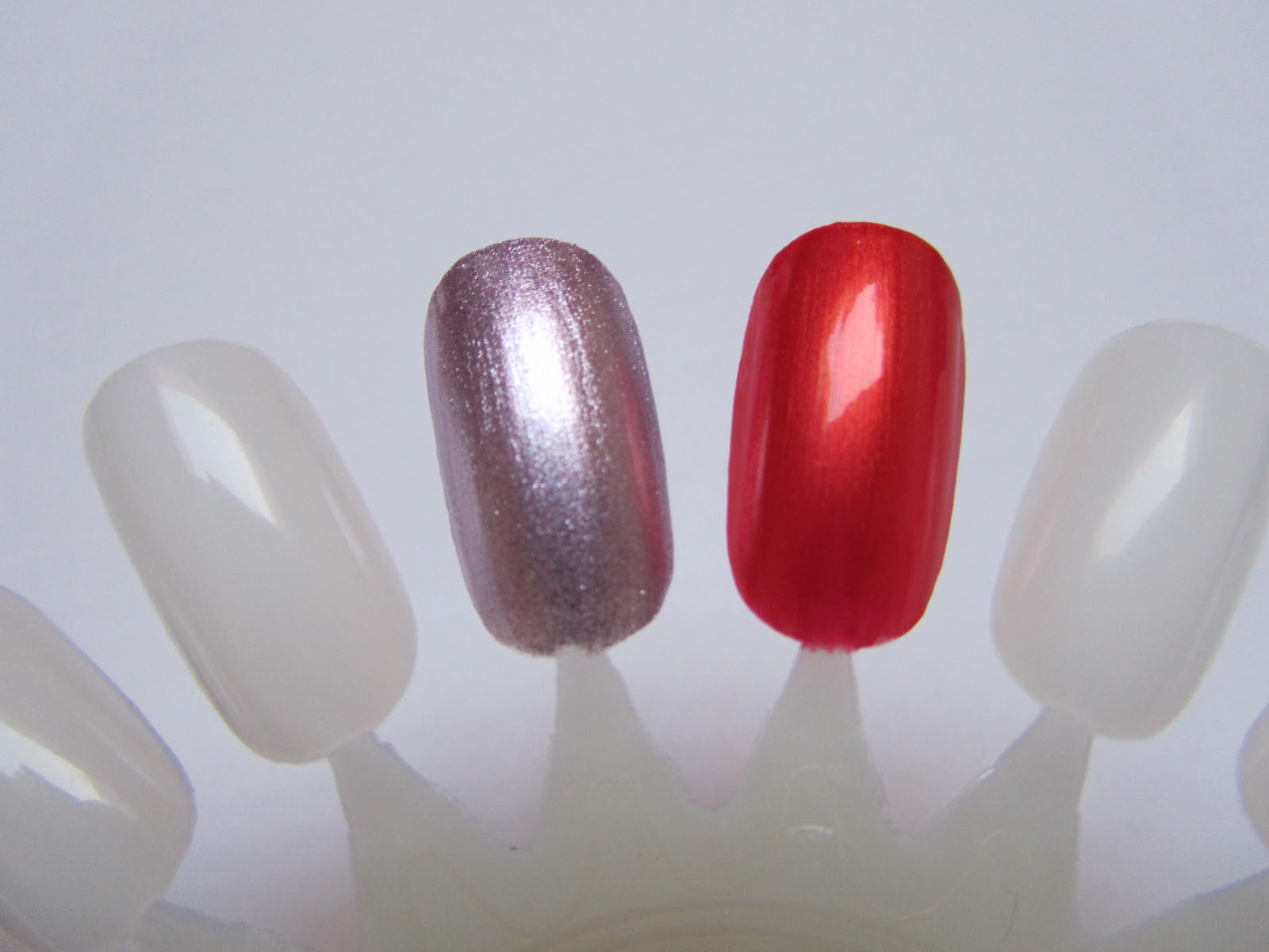 | De swatches. Het paarse heeft eerder een metallic finish. De rode heeft een mooie gouden shimmer. |