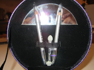 | Tot mijn verbazing was dit setje vrij compleet! 2 lippenstiften, 2 nagellaken, een doosje met 2 kleurtjes oogschaduw, een lippotlood, een oogpotlood en 2 borsteltjes. |
