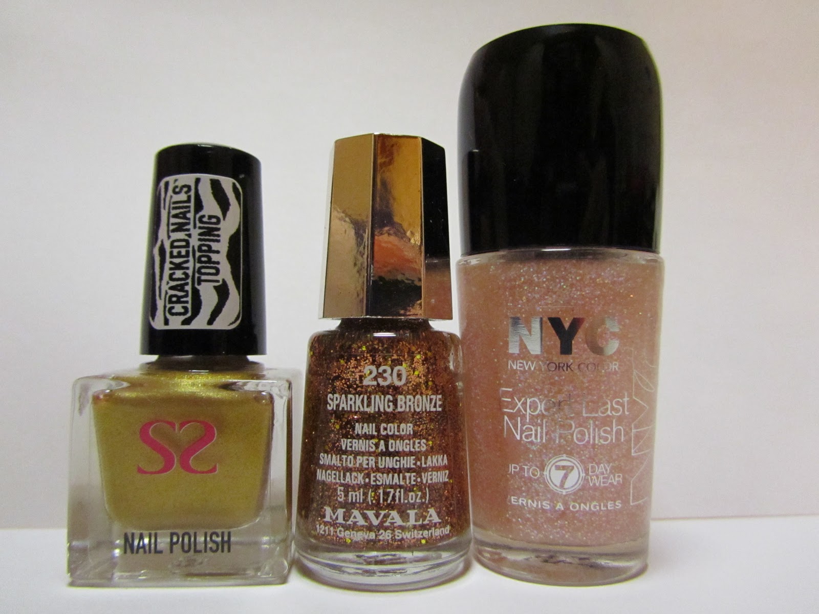 | SS crackle 004, Mavala 230 Sparkling bronze, NYC 155 Gramercy Glitz |