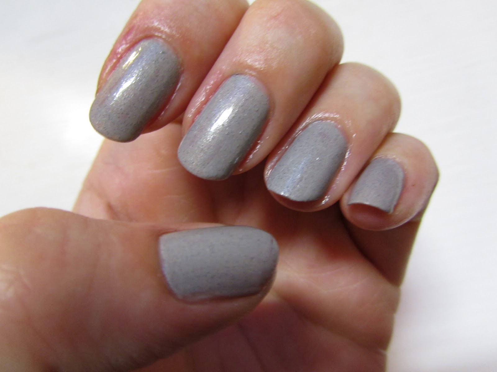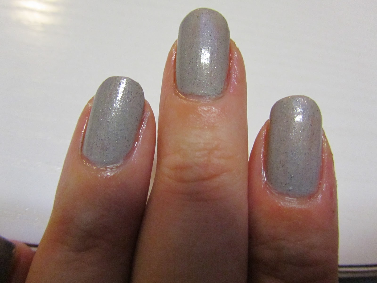 Het is een lichtgrijs kleurtje met donkere stipjes die er precies bovenop liggen. De stipjes zijn zwart of heel donker grijs, maar er zitten ook enkele glitters tussen.