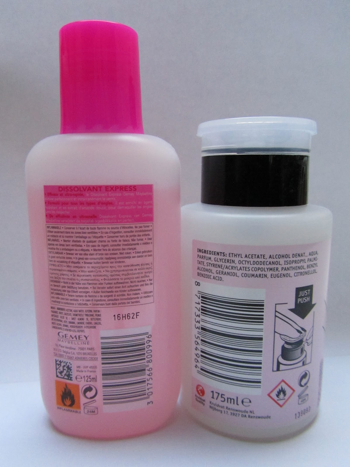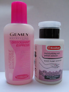 Mijn gewone dissolvant/remover is er eentje van Gemey. Ik vind hem enorm goed en vind hem erg lekker ruiken. Er staat niet voor niets op "met amandelextract". Deze dissolvant is echt aangenaam om te gebruiken. Ik draai het dopje eraf, houd mijn watje ertegen, draai het flesje even om en ik heb een watje vol remover.