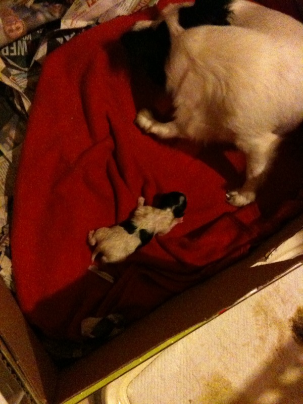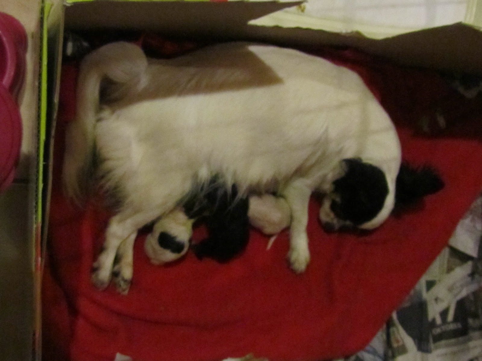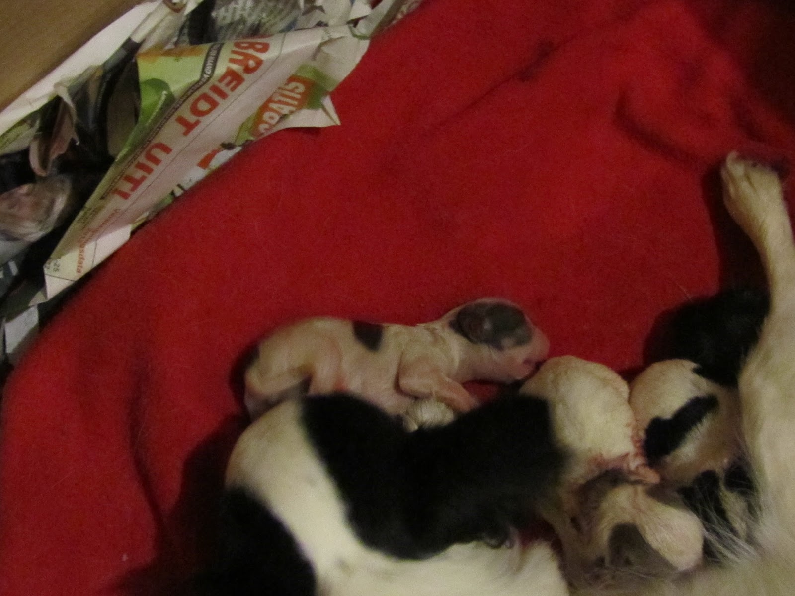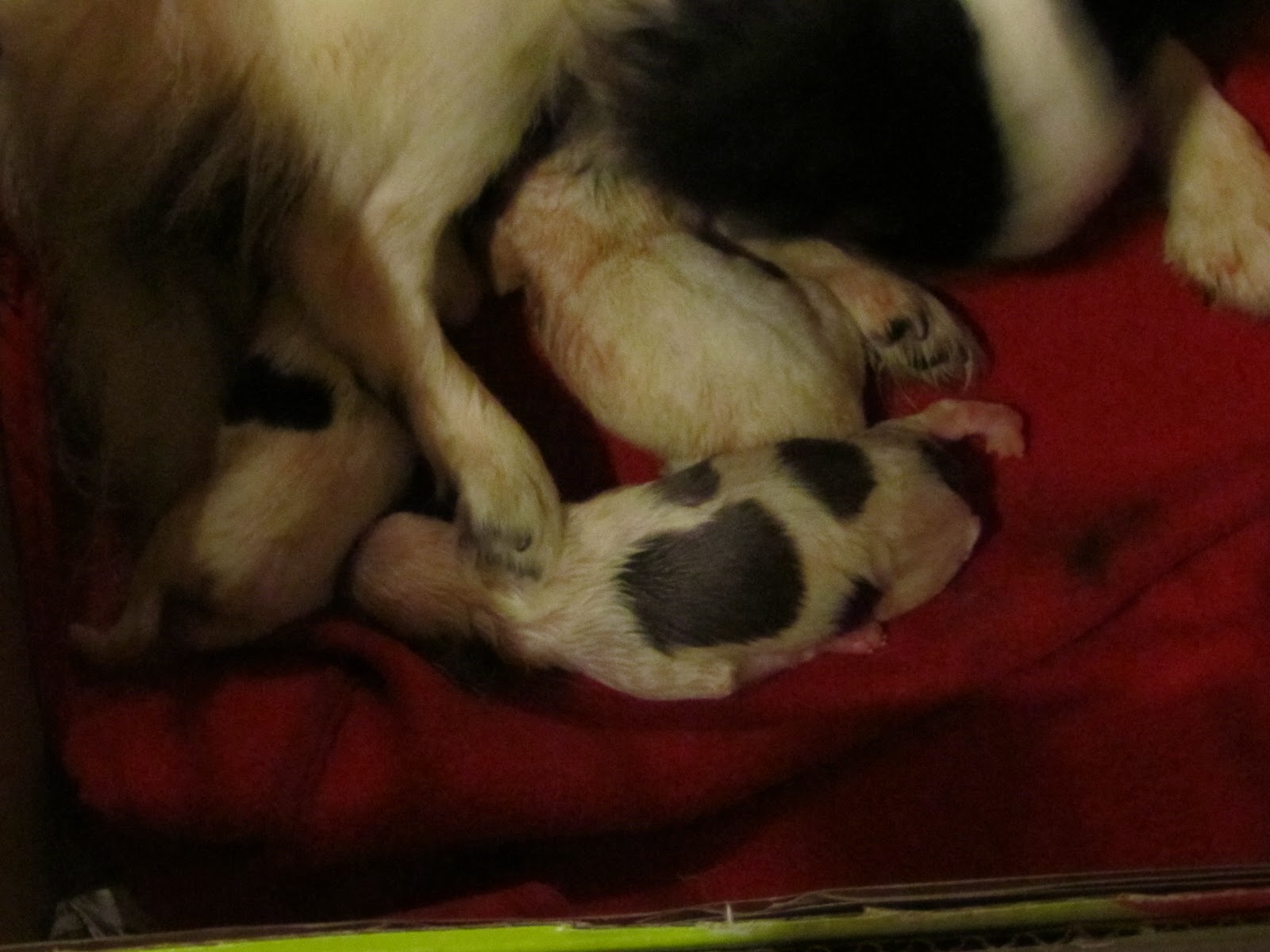 | Op een 2 tal uurtjes tijd bracht ze 4 pups ter wereld. 2 uur na na het werpen van de 1e pup en net toen we dachten dat het gedaan was, kwam pupje nurmmertje 5! |