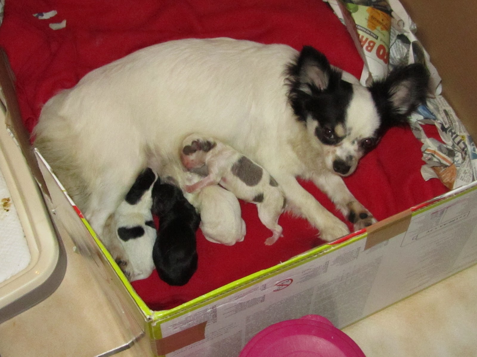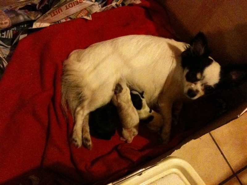 Onze chihuahua is bevallen! Oorspronkelijk had ze 5 pupjes, maar er is helaas eentje overleden.
